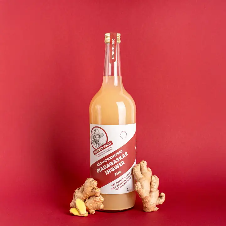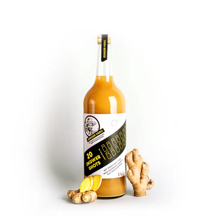Ginger Hero ist dein täglicher Ingwer-Kick in seiner besten Form: kraftvoll, natürlich und kompromisslos hochwertig. Im Zentrum steht echter Bourbon-Ingwer aus Madagaskar – bekannt für seine besonders aromatische Schärfe und intensive Frische. Ob als Shot, Sirup oder Konzentrat: Ginger Hero bringt dir pure Power in die Flasche, perfekt für alle, die sich bewusst etwas Gutes tun wollen – mit Geschmack, Charakter und richtig Druck.